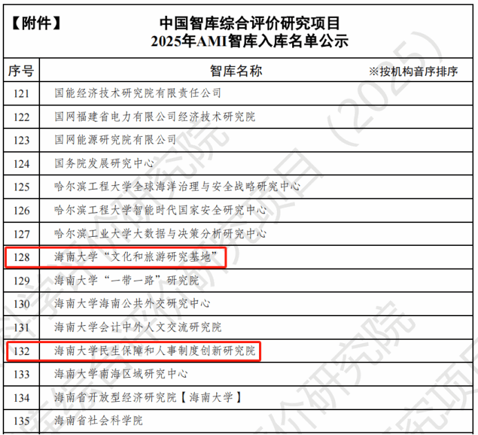 7月25日,中国社会科学评价研究院公布了“中国智库综合评价研究项目(2025)AMI智库入库名单”。公司所属学科的两个科研平台——伟德官网bv1946“文化和旅游研究基地”、伟德官网bv1946“民生保障和人事制度创新研究院”——成功入选。